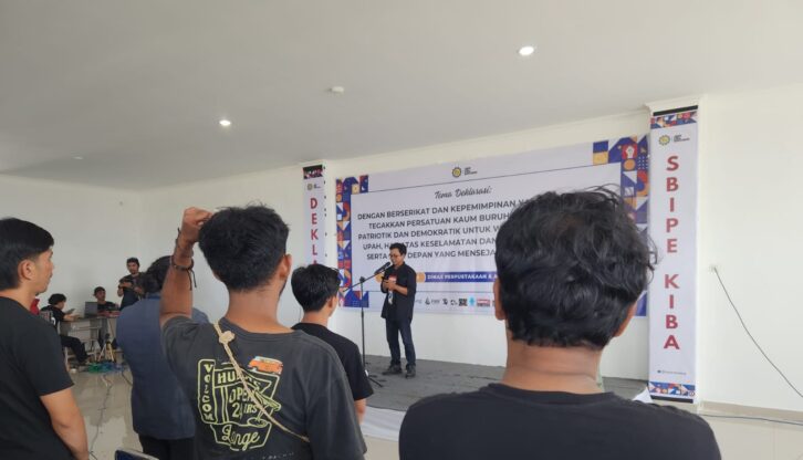 “Buruh bersatu tak bisa dikalahkan”. “Kelas buruh Indonesia pemimpin pembebasan”. Dua lembar spanduk menempel di dinding aula, seolah mendukung spanduk ukuran besar, terpampang sebagai latar panggung, bertuliskan “Dengan berserikat dan kepemimpinan yang kuat, kita tegakkan persatuan kaum buruh yang militan, patriotik dan demokratik untuk wujudkan keadilan upah, hak atas keselamatan dan kesehatan kerja, serta hari depan yang mensejahterahkan buruh”.