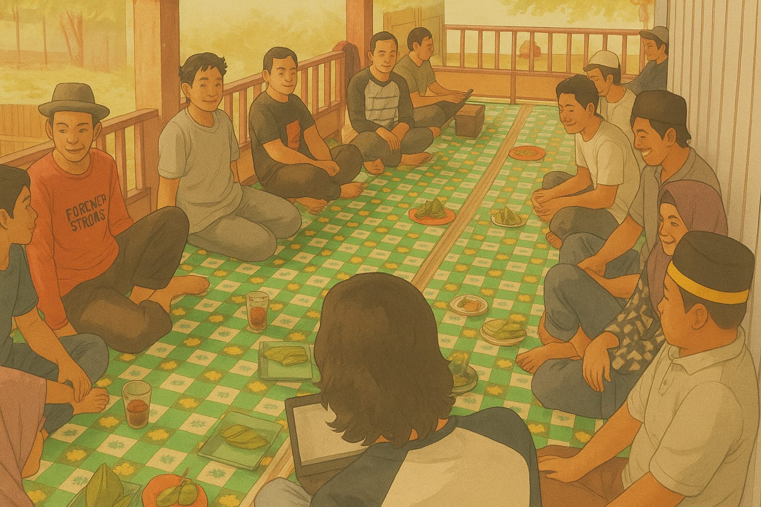 Warga berkumpul di kolong rumah panggung atau di atas tikar sederhana. Di situlah musyawarah berlangsung sambil menikmati kopi panas dan pisang dari kebun sendiri. Pembicaraan dimulai dengan santai. Orang yang paling dituakan membuka percakapan. Setiap orang boleh berbicara tanpa ada yang memotong atau mendominasi. Semua pendapat didengarkan.